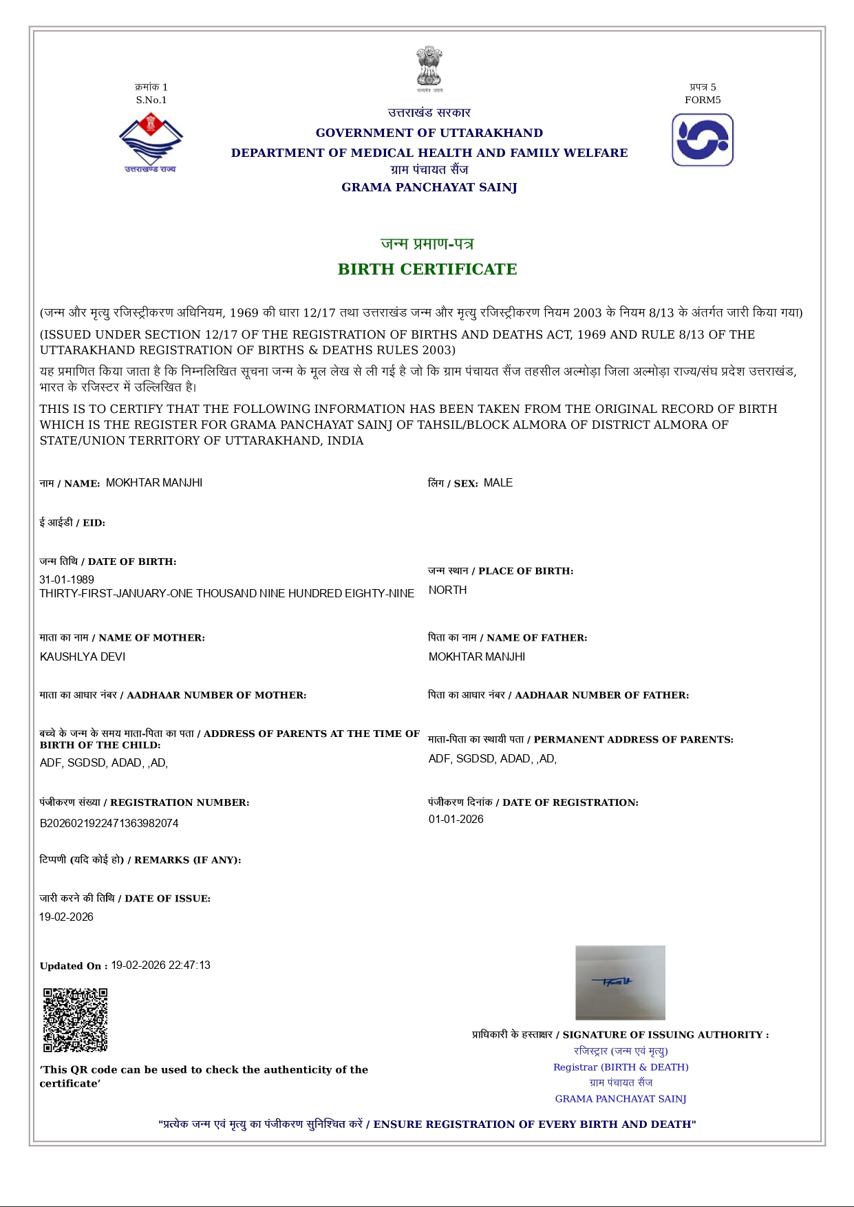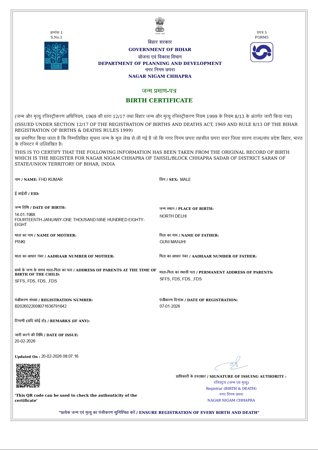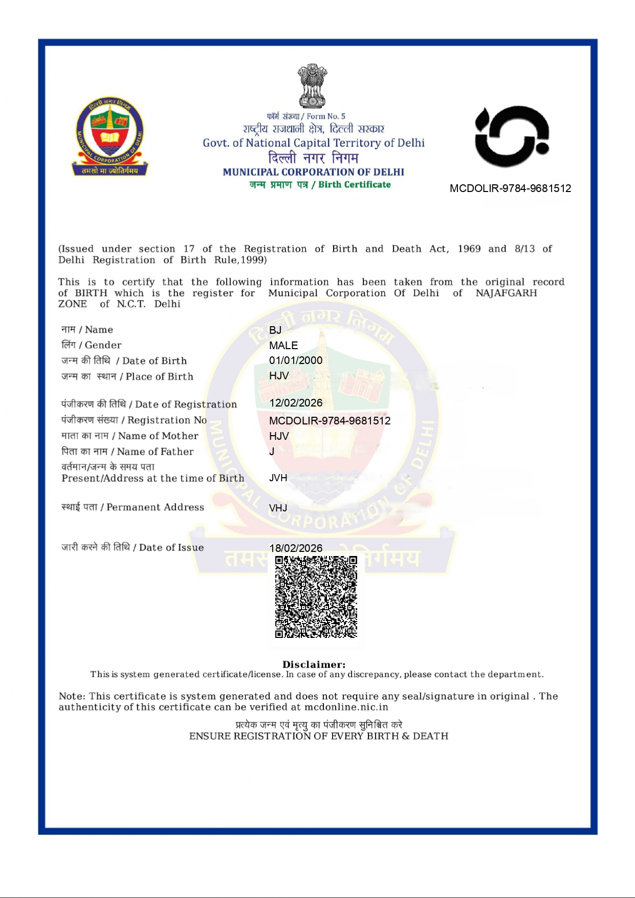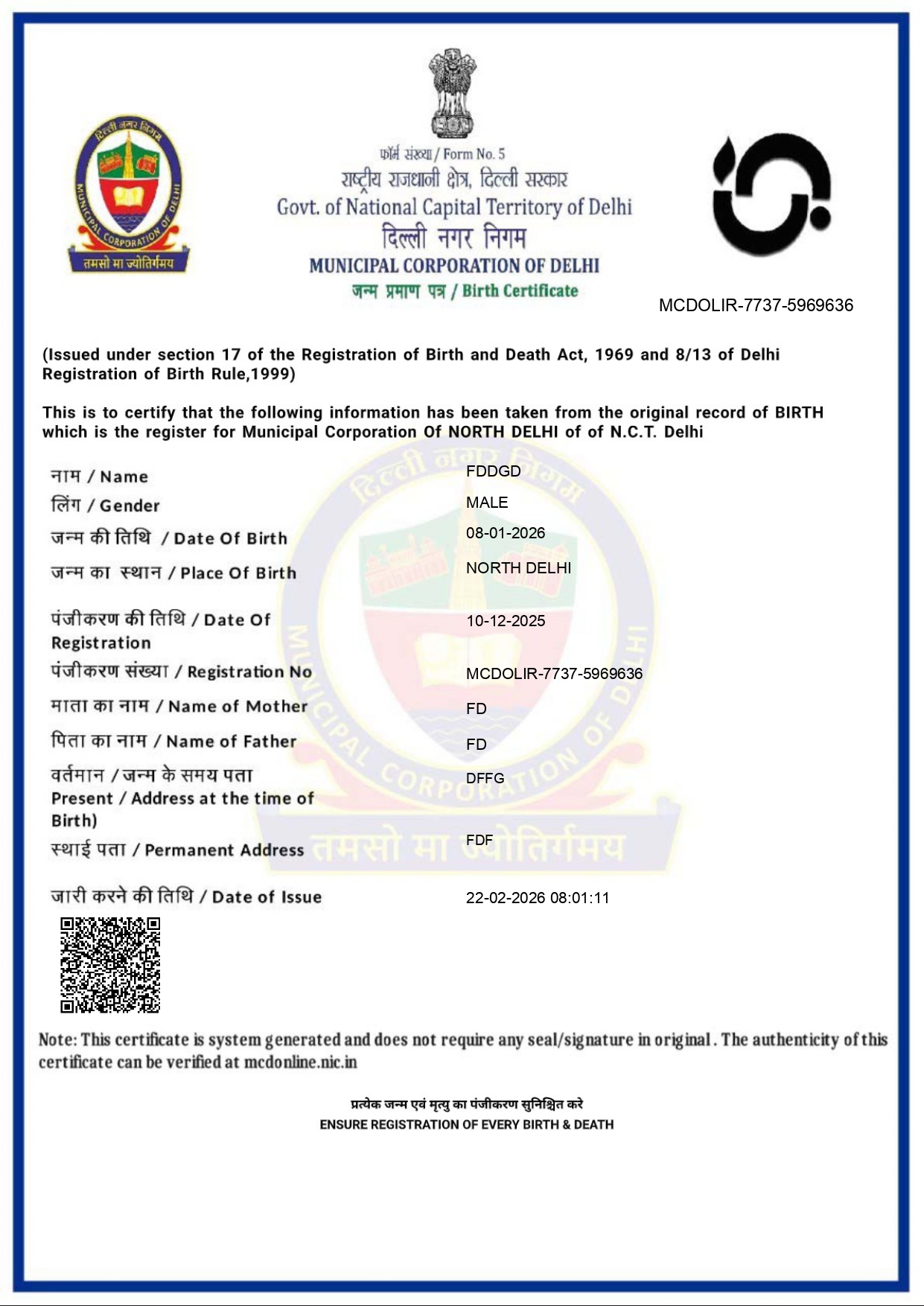 Delhi Govt Style Birth Certificate PDF Generator with QR