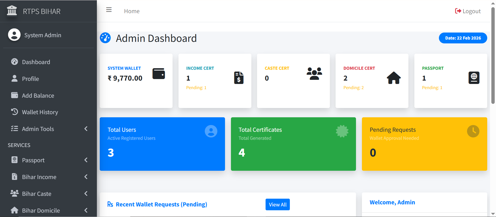 RTPS Bihar Portal PHP Script with Admin Dashboard & Wallet System (Income, Caste, Domicile, Passport)